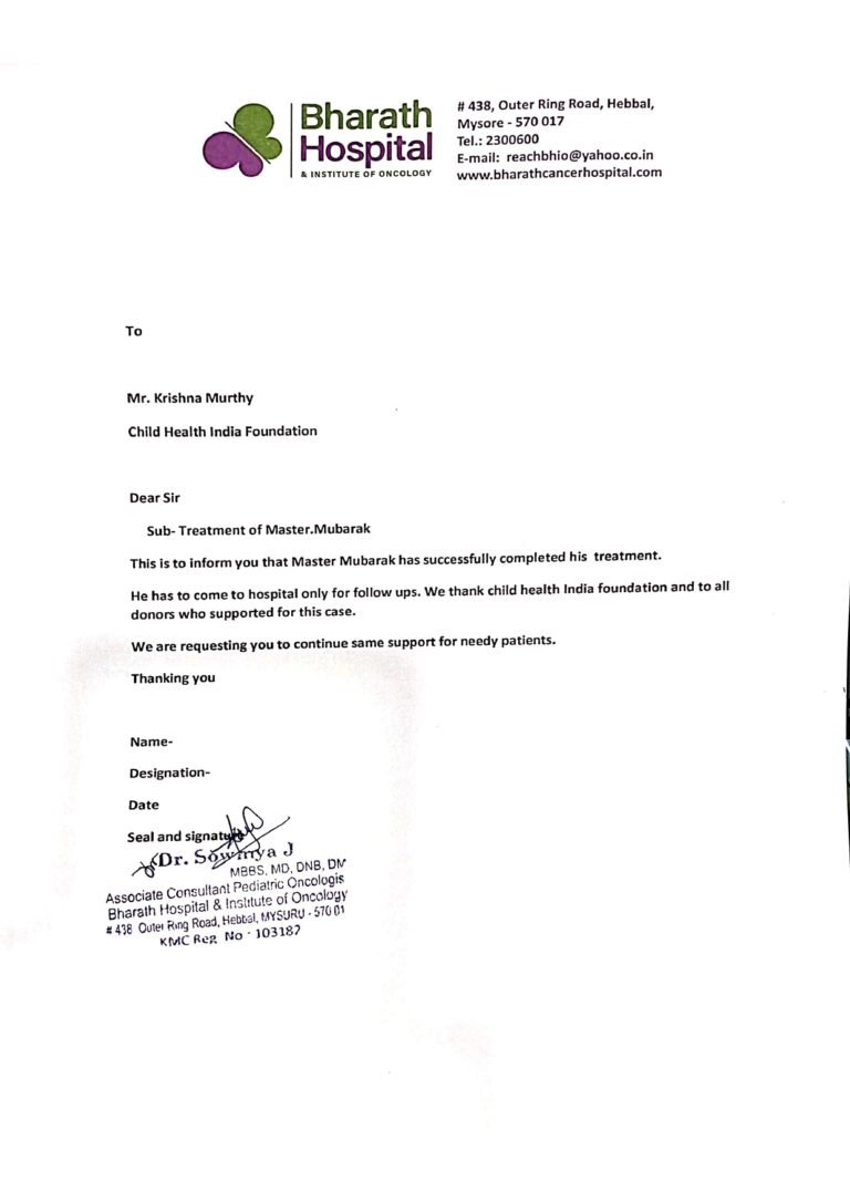 Child Health India Foundation is a non-profit organization working on this medical case. Our motto is to raise sufficient funds for Master Mubarak to complete his treatment.