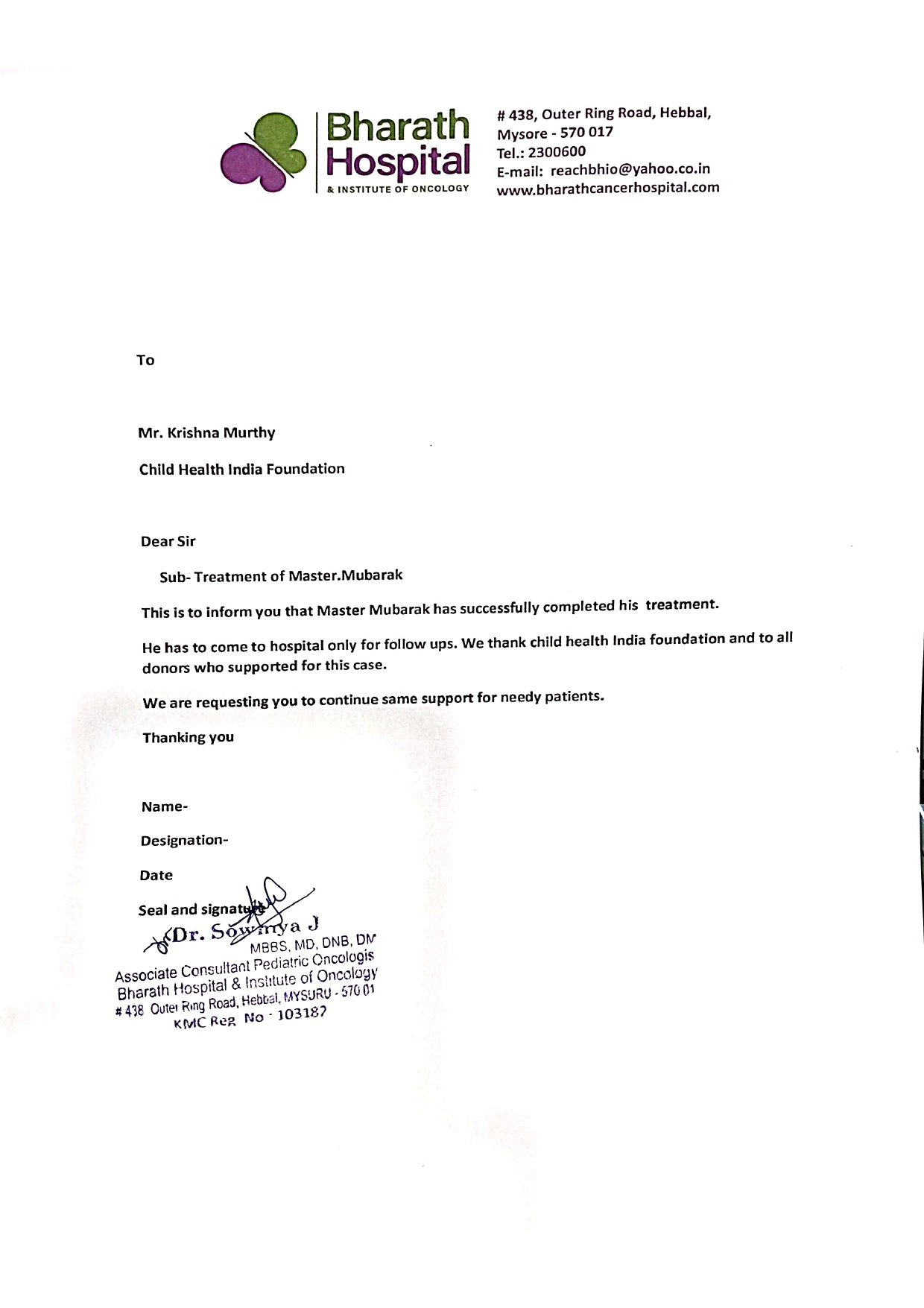 Bharath Cancer Hospital Mysore, treating this child has referred this case for financial support.